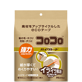 テープは、繊維の奥まで入り込んでゴミをしっかりキャッチする『スパイクドット粘着』を採用。Nittoグループの製造工程で発生する廃材をアップサイクルした紙厚でめくりやすいクラフト紙を使用した地球にも優しい製品です。