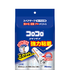 Nittoグループの製造工程で発生する廃材をアップサイクルした、紙厚でめくりやすいクラフト紙を使用した環境配慮型のコロコロです。繊維の間に入り込んで細かいホコリもしっかりキャッチするスパイクドット粘着を採用しています。めくり口がわかりやすく、切りやすい「スカットカット」機能も搭載しています。