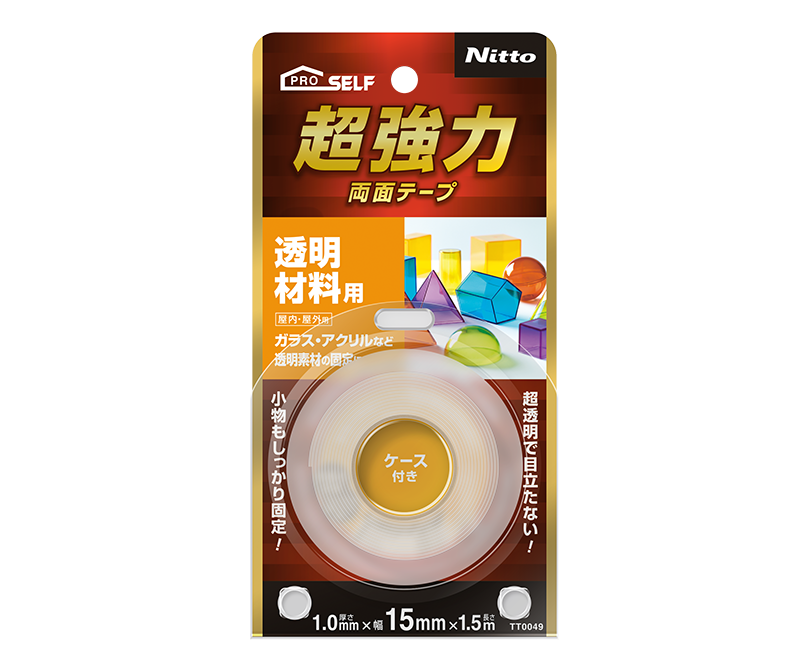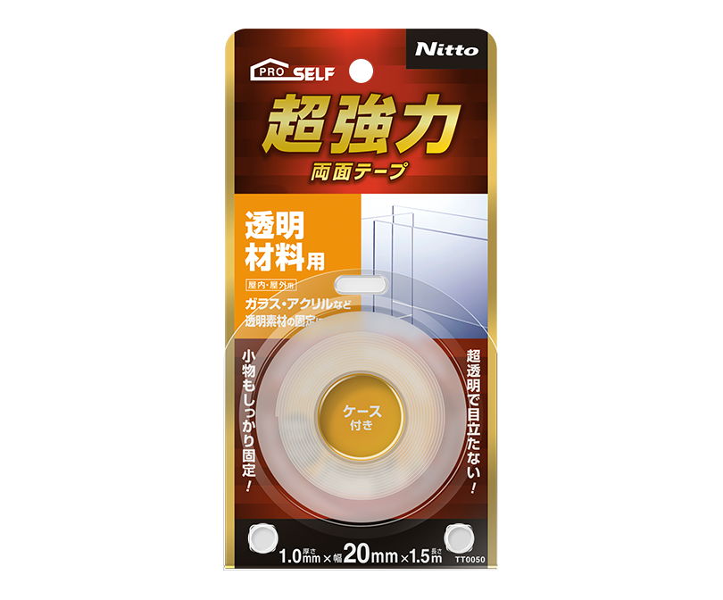 透明なので貼りあとが目立たず、ガラスやアクリルなどの透明素材の接着・固定や補修に最適です。